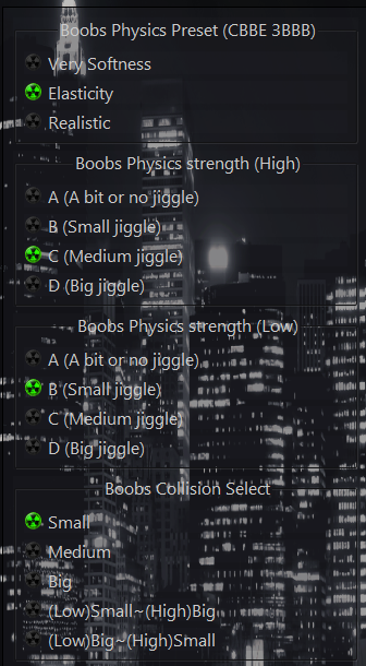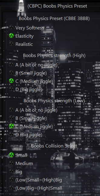 1) Если вас так же, как и меня, раздражают мерзко дрыгающиеся брюхо, жопа и ноги, то вы можете отключить их, удалив файлы CBPConfig_belly, CBPConfig_butt и CBPConfig_leg по адресу SKSE\Plugins. Так же это сэкономит вам парочку FPSинок. Можно ещё удалить CBPConfig_BellyAmplitude, CBPConfig_ButtAmplitude и CBPConfig_LegAmplitude на всякий, но, кажется, и с этими файлами в папке физика прекрасно отключится.